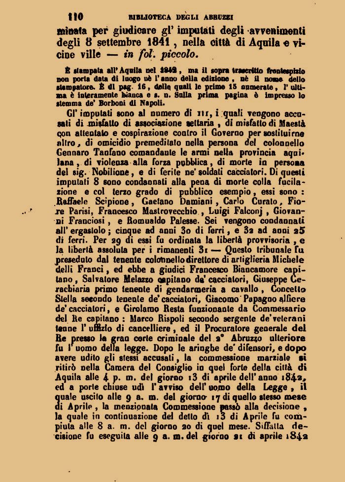 Gì* imputati sono al numero di ilr, i quali Tengono accusati di misfatto di associazione settaria , di misfatto di Maestà qon attentato e cospirazione contro ii Governo per sostituirne nitro, di omicidio premeditato nella persona del colonnello Gennaro Tanfano comandante le armi nella provincia aquilana , di violenza alla forza pubblica, di morte in persola del sig. Nobilume, e di ferite ne'soldati cacciatori. Di questi imputati 8 sono condannati alla pena di morie colla fucilazione e col terzo grado di pubblico esempio, essi sono : Raffaele Scipione, Gaetano Damiani , Carlo Curato, Fio-jre Parisi, Francesco Mastroveccbio , Luigi Falconj , Giovanni Franciosi , e Romualdo Palesse. Sei vengono condannati all' ergastolo ; cinque ad anni 3o di ferri, e 3a ad aoni 25 di ferri. Per 29 di essi fu ordinata la libertà provvisoria , e la libertà assoluta per i rimanenti Si — Questo tribunale Tu preseduto dal tenente colonnello direttore di artiglieria Michele del li Franci, ed ebbe a giudici Francesco Biancamore capitano , Salvatore Melazzo ospitano da' cacciatori, Giuseppe Ce-racbiaria primo tenente di gendarmeria a cavallo , Concetto Siella secondo tenenle de'cacciatori, Giacomo Papa alfiere de' cacciatori, e Girolamo Resta funzionante da Comraessario del Re capitano : Marco Rispoli secondo sergente de'veterani tenne 1' uffizio di cancelliere, ed il Procuratore generale del He presso la gran corte criminale del a® Abruzzo ulteriore fu I uomo dell la legge. Dopo le aringhe de' difensori, e dopo avere udito gli stessi accusati, la commessione marziale ti ritirò nella Camera del Consiglio io quel forte della città di Aquila alle 4 P- m. del giorno i3 di aprile dell'anno i$42> ed a porte chiuse udì 1* avviso dell' uomo della Legge , il