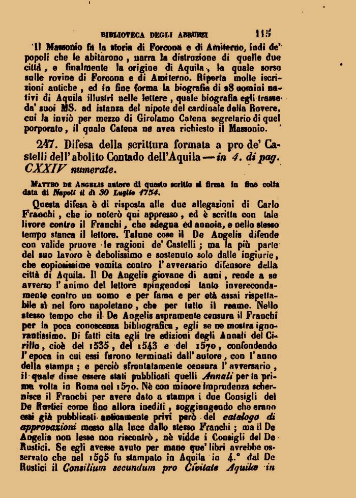 Questa difesa è di risposta alle due allegazioni di Carlo Franchi , che io noterò qui appresso, ed è scritta con tale livore contro il Franchi, che sdegna ed annoia, e oello stesso tempo stanca il lettore. Talune cose il De Aogelis difende con valide pruove le ragioni de' Castelli ; ma la più parte del suo lavoro è debolissimo e sostenuto solo dalle ingiurie, che copiosissime vomita conlro l'avversario difensore della città di Aquila. Il De Angelis giovane di anni, rende a se avverso 1' animo del lettore spingendosi tanto inverecondamente contro un uomo e per fama e per età assai rispettabile si nel foro napoletano, che per tutto il reame. Nello stesso tempo che il De Angelis aspramente censura il Franchi per la poca conoscenza bibliografica, egli se ne mostra ignorantissimo. Di fatti cita egli tre edizioni degli Annali del Cirillo , cioè del i535 , del i543 e del 1570, confondendo J'epoca in cui essi furono terminati dall' autore, con l'anno delia «lampa ; e perciò sfrontatamente censura l'avversario , il quale' disse essere slati pubblicati quelli Annali per la prima volta in Roma nel 1^70. Nè con minore imprudenza schernisce il Fraocht per avere dato a stampa i due Gonsigli del De Rustici come fino allora ioediti, soggiongeodo che erano esi» già pubblicati- anticamente privi però del catalogo di approvazioni messo alla luce dallo stesso Franchi ; ma il De Angelis non lesse non riscontrò, nè vidde i Consigli del De Rustici. Se egli avesse avuto per mano que' libri avrebbe os» servato che nel 15p5 fu stampalo in Aquila io 4- ° dal De Rustici il Consiliwn secundum prò Ctvilale Aquila in