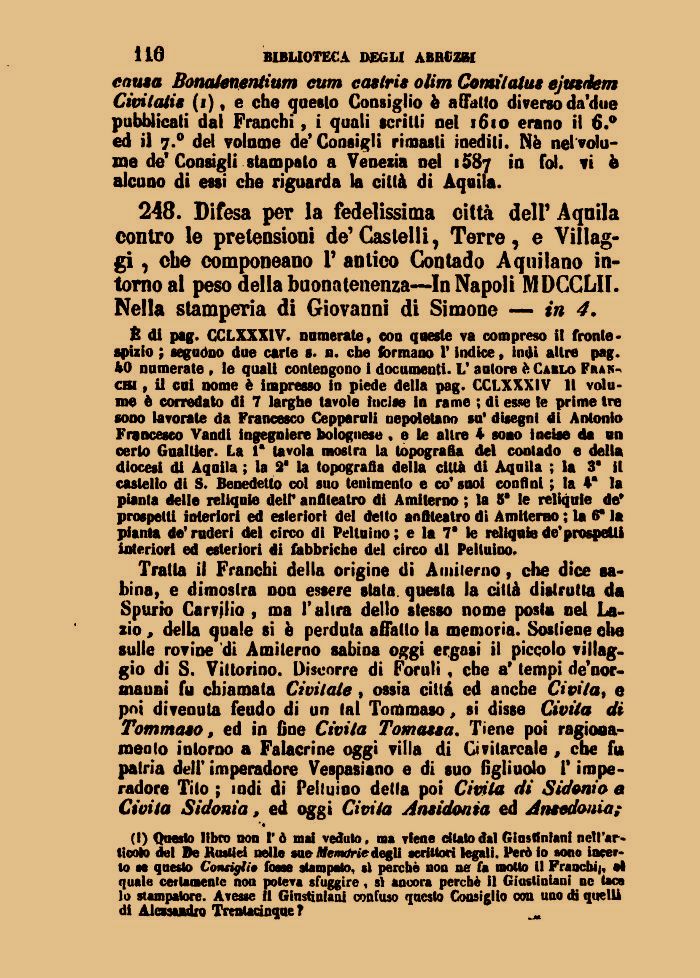 248. Difesa per la fedelissima città dell1 Aquila contro le pretensioni de1 Castelli, Terre, e Villaggi , che componeano 1' antico Contado Aquilano intorno al peso della buonatenenza—In Napoli MDCCLII. Nella stamperia di Giovanni di Simone — in 4.