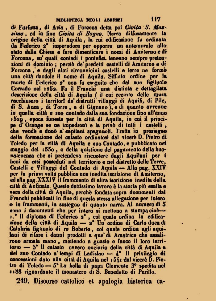 di Furfooa > dì Avia , di Forcona delta poi Civita Massimo , ed io fine Civita di Bagno. Narra diffusamente la origine della città di Àquila, la cui edificazione fu ordinata da Federico 2° imperadore per opporre un antemurale allo stalo della Chiesa e fare dimenticare i nomi di Amiterno e di Forcona, su' quali contadi i pontefici teneano sempre proteo-zioni di dominio ; perciò de' predetti castelli di Amiterno e di Forcona ,* e degli altri circonvicini castelli e terre ne formò una città dandole il nome di Aquila. Siffatto ordine per la morie di Federico 2° non fu eseguito che dal suo figliuolo Corrado nel i25a. Fa il Franchi una distinta e dettagliata descrizione della città di Aquila ( il cui recinto delle mura racchiusero i territori de* distrutti villaggi di Aquili, di Pile, di S. Anza, di Torre, e di Gignano), e di quanto avvenne in quella città e suo contado dalla sua fondazione fioo all'anno 1529 , epoca funesta per la città di Aquila, in cui il principe d'Orange te ne impadronì e la privò di tulli i castelli , che vendè e dooò a' capitani spagnuoli. Tratta in prosieguo della formazione del catasto ordinatosi dal viceré D. Pietro di Toledo per la cillà di Àquila e suo Contado, e pubblicato nel maggio del i55o, e della quistione del pagamento delia buor natenenza che si pretendeva riscuotere dagli Aquilani per i beni da essi posseduti nel territorio e nel distretto delle Terre, Castelli e Villaggi del Contado di Aquila — Alla pag. XXIV per la prima volta pubblica una inedita iscrizione di Amiterno, edalia pag XXXIV il frammento di altra iscrizione inedita della città di Àofidate. Questo dottissimo lavoro è la storia più esatta e vera della città di Aquila, perchè fondata sopra documenti dal Franchi pubblicati in fine di questa slessa allegazione per intero o in frammenti, iu sostegno di quanto narra. Al numero di 5 sono i documenti che per inlero si mettono a stampa cioè— i.* 11 diploma di Federico 2° , col quale ordina la edificazione della città di Aquila — 2° Un ordine di Carlo duca dì Calabria figliuolo di re Roberto , col quale ordina agli aquilani di rifare i danni prodotti a que'di A matrice che assalirono armata mano, mettendo a guasto e fuoco il loro territorio — 3° 11 catasto ovvero onciario della ciltà di Aquila e del suo Contado a' (empi di Ladislao — 4° H privilegio di concessioni dato alla città di Aquila nel i5,.i dal viceré D. Pietro di Toledo — 5° La bolla di papa Clemente 3° spedita net ji88 riguardante il monastero di S. Benedetto di Perillo.