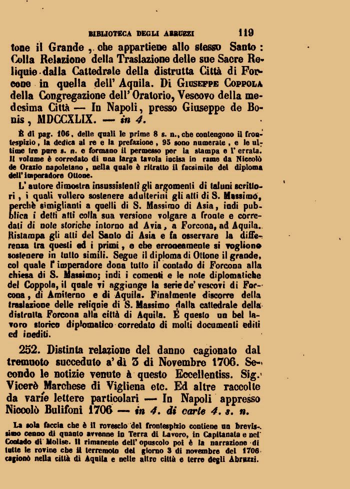 L'autore dimostra insussistenti gli argomenti di taluni scrittori , i quali vollero sostenere adulterini gli atti dì S. Massimo, perchè simigliatili a quelli di S. Massimo di Asia, iodi pubblica i detti atti colla sua versione volgare a Ironie e corredati di noie storiche intorno ad A via, a Forcona, ad Aquila. Ristampa gli atti del Santo di Asia e fa osservare la aifie-: rema tra questi ed i primi, e cbe errooeamenle si vogliono sostenere in tutto simili. Segue il diploma di Ottone il grande, col quale f imperadore dona tutto il contado di Forcona alla chi«sa di S. Massimo; indi i conienti e le note diplomatiche del Coppola, il qoale vi aggiunge la serie de'vescovi di Forcona , di Amilerno e di Aquila. Finalmente discorre della traslazione delle reliquie di S. Massimo dalla cattedrale della distrulta Forcona alla città di Aquila. E questo un bel lavoro storico diplomatico corredato di molti documenti edili ed inediti.