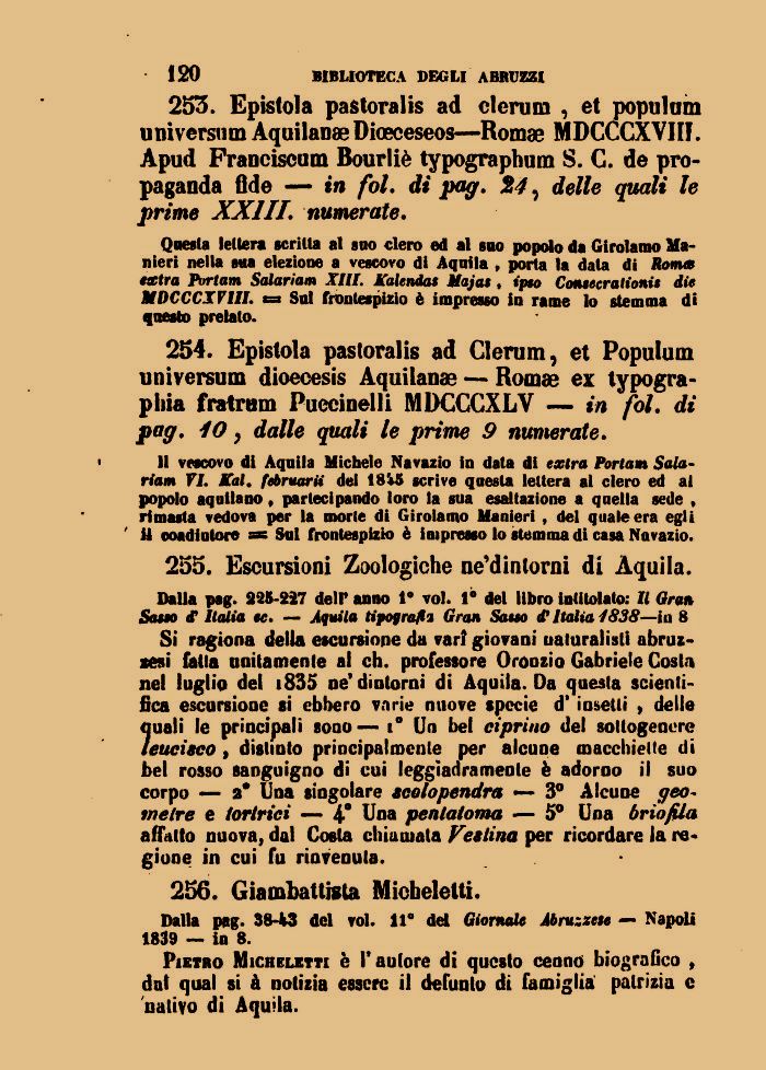 253. Epistola pastoralis ad clerum , et populam universum ŔquilanseDioeceseos—Romae MDCCCXVHI. Ŕpud Franciscum Bourlič typographum S. C. de propaganda fide — in fol. di pag. %4, delle quali le prime XXIII. numerate.