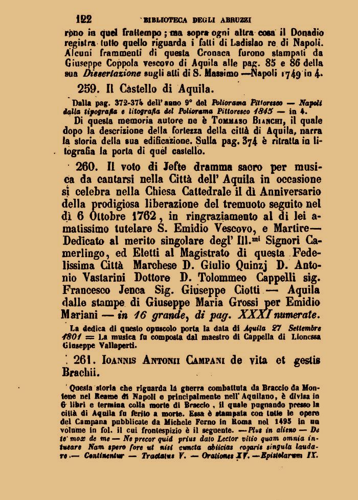 260. Il voto di Jefte dramma sacro per musica da cantarsi nella Città dell' Aquila in occasione si celebra nella Chiesa Cattedrale il dì Anniversario della prodigiosa liberazione del tremuoto seguito nel dì 6 Ottobre 1762, in ringraziamento al di lei a-matissimo tutelare S. Emidio Vescovo, e Martire— Dedicato al merito singolare degl' Ill.mi Signori Camerlengo, ed Eletti al Magistrato di questa Fedelissima Città Marchese D. Giulio Quinzj D. Antonio Yastarini Dottore D. Tolommeo Cappelli sig. Francesco Jenca Sig. Giuseppe Ciotti — Aquila dalle stampe di Giuseppe Maria Grossi per Emidio Mariani — in 46 grande, di pag. XXXI numera te.