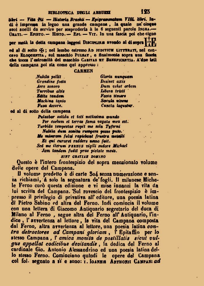 11 volume predetto è di carte So4 senza numerazione e senza richiami, & solo la segnatura de'fogli. Il milanese Michele Feroo curò questa edizione e vi mise innanzi la vita da lui scrina del Campana. 'Sul rovescio del frontespizio è impresso il privilegio di privativa all' editore, una poesia latina di Pietro Sabino ed altra del Ferno. Indi comincia il volume con una lettera di Giacomo Antiquario segretario del duca di Milano al Ferno , segue altra del Feroo all' Antiquario, l'indice , T avvertenza al lettore, la vita del Campaoa composta dal Feroo, altra avvertenza al lettore, una poesia latina contro detractores ad Campani gloriam , Y Epitaffio per Io stesso Campana, I* amica monito de postillatis sicut vul• gus appellai codicibus devitandis , la dedica del Ferno al cardinale Gio. Antonio Alessandrino ed una poesia latina dello slesso Ferno. Cominciano quindi le opere del Campana col fol. segnato a it e sono: i. Ioahhis Ahthonh Campaiìi ad