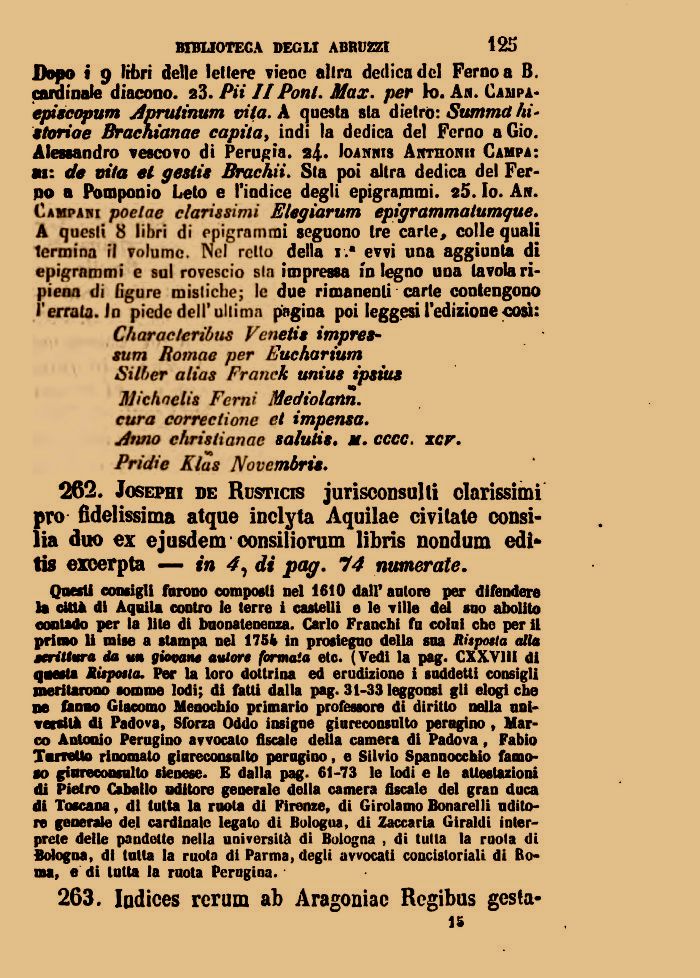 262. Josephi de Rusticis jurisconsulti Diarissimi prò fìdelissima atque inclyta Àquilae civitate Consilia duo ex ejusdem consiliorum libris nondum editò excerpta — in 4, di pag. 14 numerate.