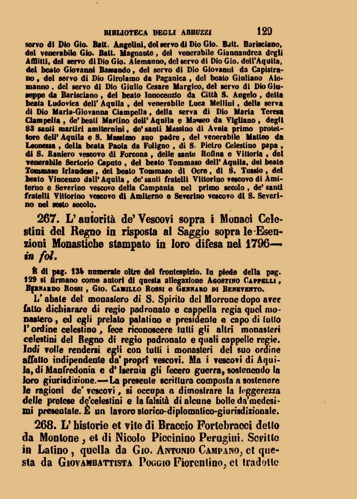 servo di Dio Già Ball. Angelini, del servo di Dio Gio. Batt. Barisciano, del venerabile Gio. Ball. Magnante, del venerabile Giannandrea degli Affilili, del servo di Dio Gio. Alemanno, del servo di Dio Gio. dell'Aquila, del bealo Giovanni Bassando, del servo di Dio Giovanni da Capiscano , del servo di Dio Girolamo da Paganica , del bealo Giuliano Aie. manno, del servo di Dio Giulio Cesare Margico, del servo di Dio Giuseppe da Barisciano, del bealo Innocenzo da Cillà S. Angelo , della beala Ludovica dell' Aquila T del venerabile Luca Melliui, della serva di Dio Maria-Giovanna Ciampella, della serva di Dio Maria Teresa Ciampella , de' beati Martino dell' Aquila e Ma«seo da Vigliano, degli 83 santi martiri amiternini, de' santi Massino di Aveia primo protettore dell' Aquila e S. Massimo suo padre , del venerabile Matleo da Leonessa , della beata Paola da Foligno , di S. Pietro Celestino papa , di S. Raniero vescovo di Forcona , delle sante Rofina e Vittoria , del venerabile Sertorio Caputo , del bealo Tommaso dell' Aquila, del beato Tommaso Irlandese, del bealo Tommaso di Ocre, di S, Tussio, del beato Vincenzo dall' Aquila , de' santi fratelli Vittorino vescovo di Ami-terno e Severino vescovo della Campania nel primo secolo , de' santi fratelli Vittorino vescovo di Amiterno e Severino vescovo di S. Severino nel sesto secolo.