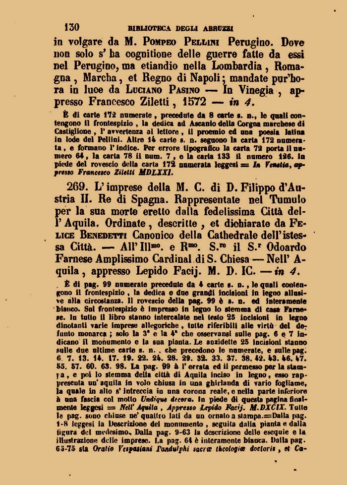 269. L'imprese della M. C. di D. Filippo d'Austria II. Re di Spagna. Rappresentate nel Tumulo per la sua morte eretto dalla fedelissima Città dell' Aquila. Ordinate, descritte , et dichiarate da Felice Benedetti Canonico della Cathedrale dell'istes* sa Città. — All' 111'0, e R®°. S.M il S.r Odoardo Farnese Amplissimo Cardinal di S. Chiesa—NelP A-quila, appresso Lepido Facij. M. D. IC. —in 4.