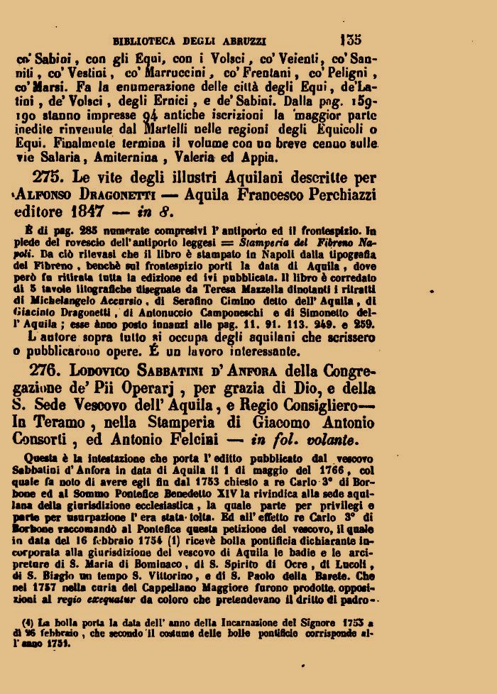 275. Le vite degli illustri Aquilani descritte per 'Alfonso Dragonetti — Aquila Francesco Perchiazzi editore 1847 — in 8.