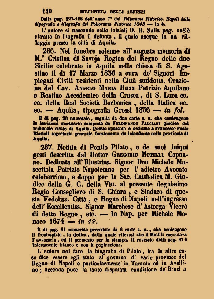 287. Notitia di Pontio Pilato, e de suoi iniqui gesti descritta dal Dottor Gregorio Motilli Capuano. Dedicata air Illustriss. Signor Don Michele Mu-scettola Patrizio Napoletano per V adietro Avocato celeberrimo, e doppo per la Sac. Cattholica M. Giudice della G. C. della Vie. al presente degnissimo Regio Consegliero di S. Chiara , e Sindaco di questa Fedeliss. Città , e Regno di Napoli nell'ingresso dell'Eccellentiss. Signor Marchese d'Astorga Viceré di detto Regno , etc. — In Nap. per Michele Monaco 1674 — in 42.