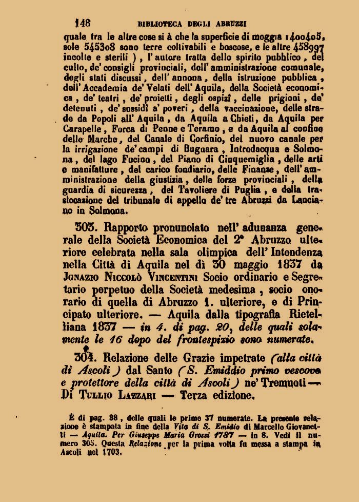 505. Rapporto pronunciato nell' adunanza gene* rale della Società Economica del 2* Abruzzo ulte« riore celebrata nella sala olimpica dell'Intendenza nella Città di Aquila nel dì 50 maggio 1857 da Jgnazio Niccolò Vincentini Socio ordinario eSegre« tario perpetuo della Società medesima , socio onorario di quella di Abruzzo 1. ulteriore, e di Principato ulteriore. — Aquila dalla tipografia Rietel-liana 1857 — in 4. di pag. 20, delle quali sola' mente le 16 dopo del frontespi%io sono numerate*