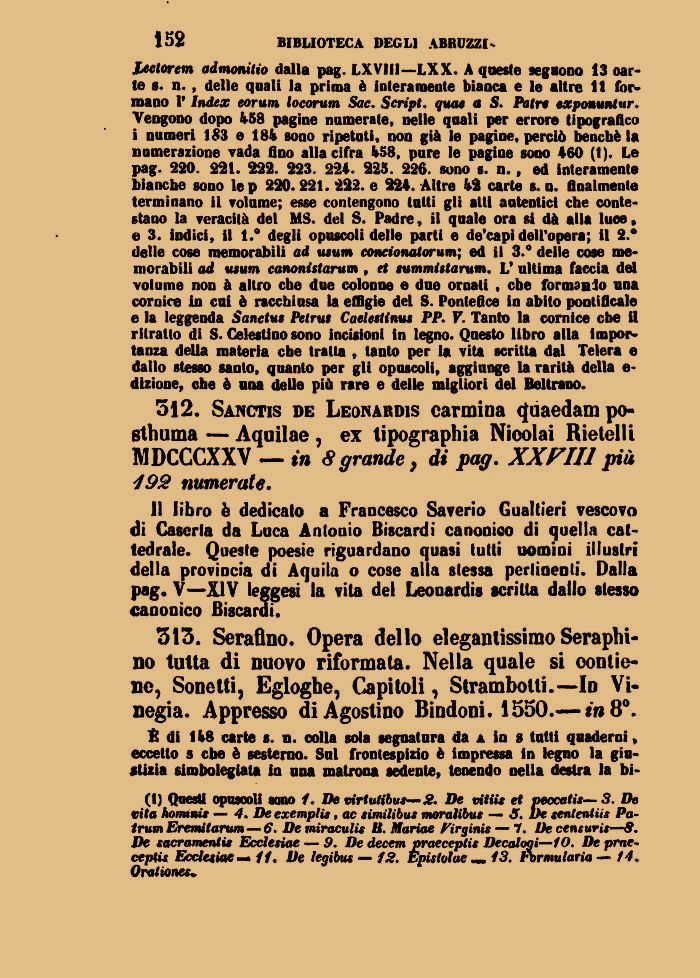 512. Sanctis de Leonardis carmina <}uaedampo-sthuma — Aquilae , ex tipographia Nicolai Rietelli MDCCCXXV — in 8 grande, di pag. XXFIIl più 492 numerate.