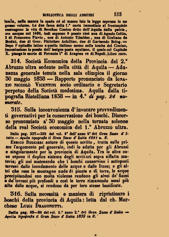 314. Società Economica della Provincia del 2.° Abruzzo ultra sedente nella città di Aquila — Adunanza generale tenuta nella sala olimpica il giorno 50 maggio 1838 — Rapporto pronunciato da Ignazio nicgolò Vicentini socio ordinario e Segretario perpetuo della Società medesima. Aquila dalla tipografìa Rie teli iana 1838 — in 4.° di pag. 24 numerate.