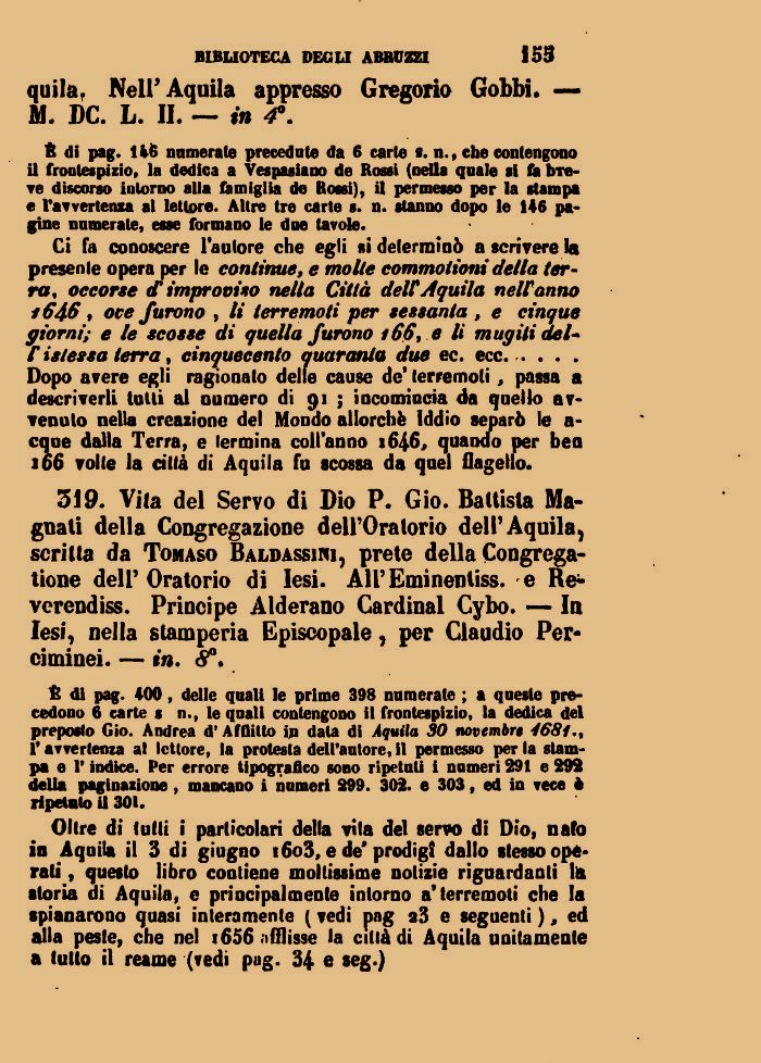 Olire di tutti i particolari della vila del servo di Dio, nato io Aquila il 3 di giugno i6o3, e de* prodigi dallo stesso operali , questo libro cootiene moltissime notizie riguardanti la storia di Aquila, e principalmente intorno a'terremoti che la spianarono quasi interamente ( vedi pag 23 e seguenti ), ed alla peste, che nel 1656 a Olisse la città di Aquila unitamente a tutto il reame (vedi pag. 34 e seg.)