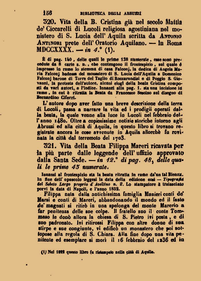 321. Vita della Beata Filippa Mareri ricavata per la più parte dalle leggende dell' uffizio approvato dalla Santa Sede. —in 12? di pag. 48 % delle qua* li le prime 45 numerale*