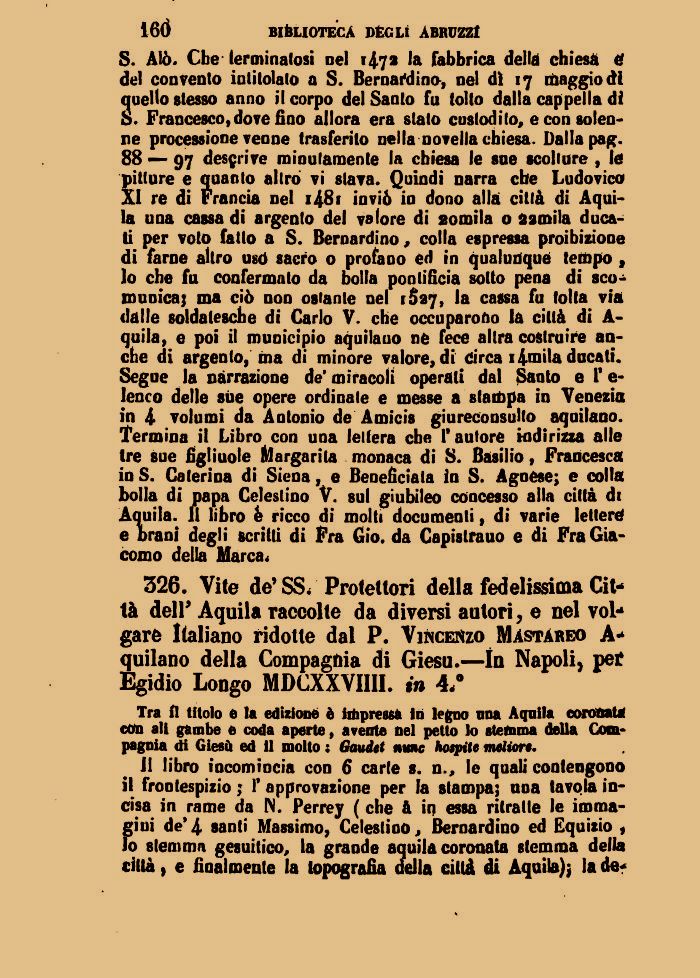 10 che fu confermato da bolla pontificia sotto pena di scomunica; ma ciò non ostante nel i$27, la cassa fu tolta via dalle soldatesche di Carlo V. che occuparono la città di A-quila, e poi il municipio aquilauo ne fece altra costruire anche di argento, ma di minore valore, di Circa 14mila ducati. Segue la narrazione de'miracoli operati dal $anto e l'elenco delle sue opere ordinale e messe a stampa in Venezia in 4 volumi da Antonio de Amicis giureconsulto aquilano. Termina il Libro con una lettera cbe l'autore indirizza alle tre sue figliuole Margarita monaca di S. Basilio, Francesca in S. Caterina di Siena, e Beneficiata in S. Agnese; e colla bolla di papa Celestino V. sul giubileo concesso alla città di Aquila. 11 libro è ricco di molti documenti, di varie letteré e brani degli scritti di Fra Gio. da Capistrauo e di Fra Giacomo della Marca*