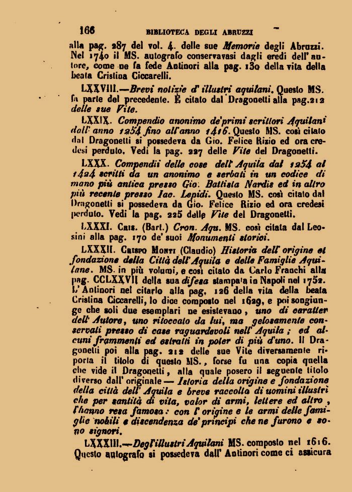 LXXVI1I.—Brevi notìzie tT illustri aquilani. Questo MS. fa parte del precedente. È citato dal Draelti alla pag.212 delle sue Fi te.