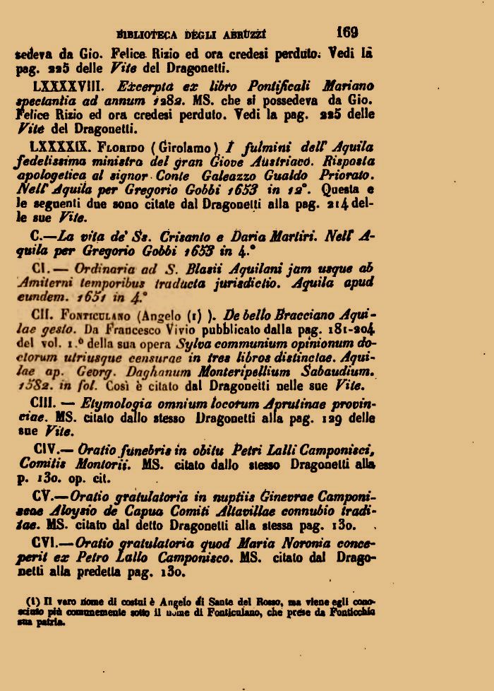Cll. FoimcuuRo (Angelo (1) ). Debello Bracciano Aqui-lae gesto. Da Francesco Vi via pubblicato dalla pag. 181-204 del voi. 1 0 della sua opera Sylva communium optnionum do-elorum viri usque censurae in tres libros di siine lae. Aqui-lae ap. Georg. Daghanum Monteripellium Sabaudium. foSs. in fot. Cos'i è citato dal Dragonetti nelle sue Vite.