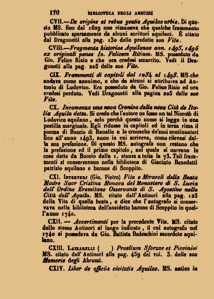 CVll.—Zfc origine et rebus gesti« Aquilae urbis. Di questo MS. fino dal 1629 non ri ma oe va che qualche frammento pubblicato sparsamente da alcuni scrittori aquilani. È citato dal Dragonetti alla pag. i3o delle predette sue Vite.
