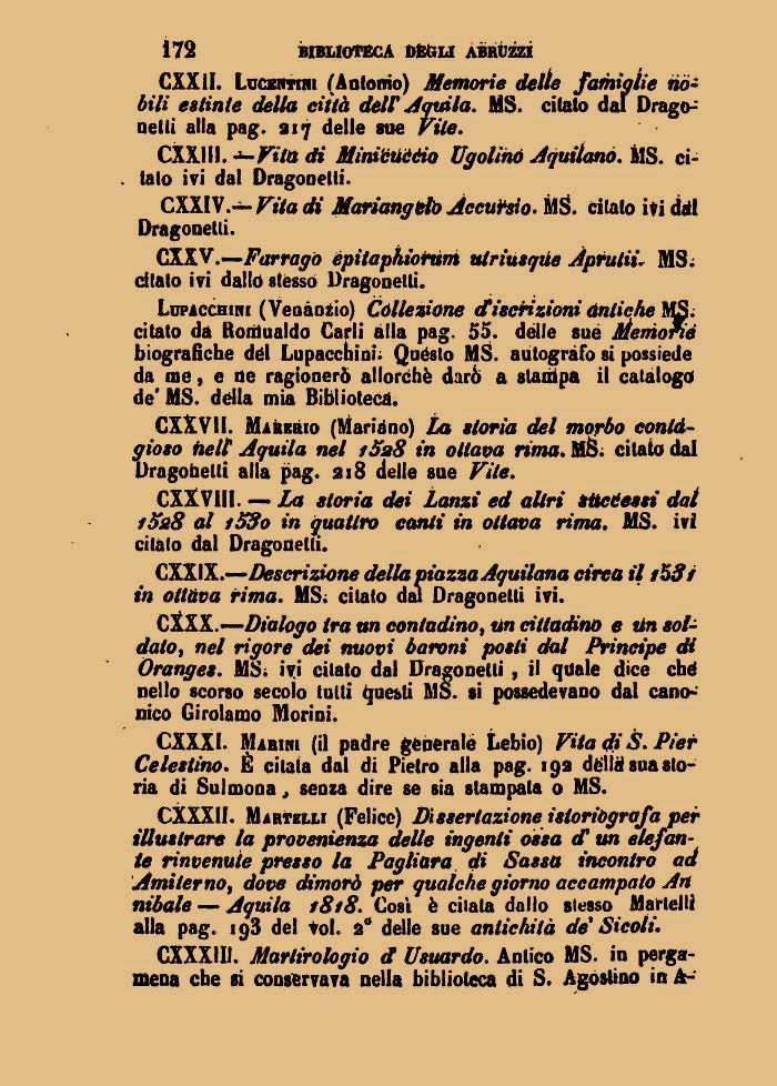 CXX1I. Lucentiui (Antonio) Memorie delle famioìie nòbili estinte della città delf Aquila. MS. citato dai Drago-' Delti alla pag. 217 delle sue Vile.