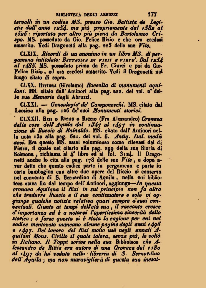 CLXXI1. Ri» o Ritiis 0 Riccio (Fra Alessandro) Cronaca delle cose dell Aquila dal i34j al i4g7 in contìnua-zione di Buccio cU Bainaldo. MS. citato dall' Antinori nel-