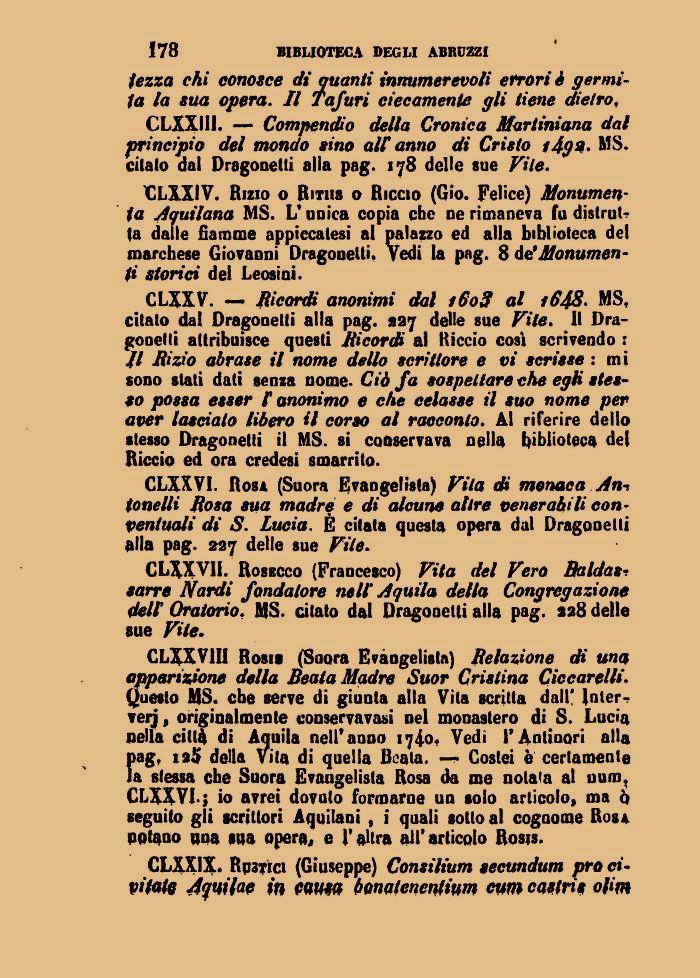 €LXXIV. Rizio o Ritiis o Riccio (Gio. Felice) Monumenta Aquilana MS. L'unica copia che ne rimaneva fu dislruU (a dalle fiamme appiccatesi al palazzo ed alla biblioteca del marchese Giovanni Dragonetti. Vedi la pag. 8 da'Monumenti storici del Leosini.