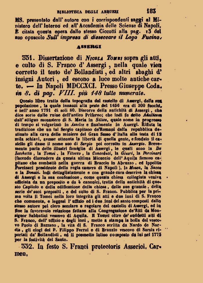 551. Dissertazione di Ni coi a Tom ti sopra gli atti, e culto di S. Franco d' Assergi , nella quale vieQ corretto il testo de9 Boll and isti, ed altri sbaghi d' insigni Autori , ed escono a luce molte antiche car-» te, In Napoli MDCCXCI. Presso Giuseppe Coda, in 8. di pag. Vilipiù 148 tutte numerale.