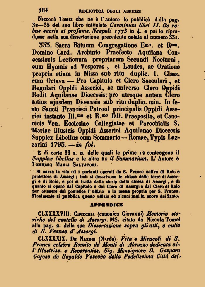 555. Sacra Rituum Congregatone Emo. et R™». Domino Card. Arcbinto Praefecto Aquilana Con-cessionis Lectionum propriarum Secundi Nocturni, «um Hymnis ad Vesperas , et Laudes, ac Oratione propria etiam in IVI issa sub ri tu duplic. 1. Class, cura Octava — Pro Capitulo et Clero Saeculari, et Regulari Oppidi A sserici, ac universo Clero Oppidi Rodii Aquilanae Dioecesis: prò utroque autem Clero totius ejusdem Dioecesis sub rilu duplio. min. In fe-sto Sancii Francisci Patroni principalis Oppidi Asse-rioi instante Ill.nao et R.m0 DD. Praeposito, et Cano-nicis Ven. Ecclesia© Collegiatae et Parochialis S. Mariae illustris Oppidi Asserioi Aquilanae Dioecesis Supplex Libellus cum Sommario—Romae, Typis Laz-zarini 1795.—in fol.