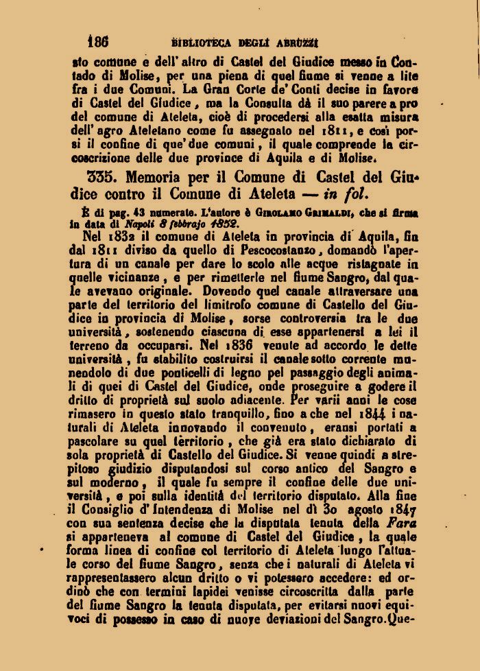 sto coniane e dell' altro di Castel del Giudice messo fu Contado di Molise, per una piena di quel fiume si renne a lite fra i due Comuni. La Gran Corte de' Conti decise in favore di Castel del Giudice, ma la Consulta dà il suo parere a prò del comune di Ateleta, cioè di procedersi alla esatta misura dell'agro Atelelano come fu assegnalo nel i8tt}e così porsi il confine di que' due comuni, il quale compreode la circoscrizione delle due province di Aquila e di Molise*