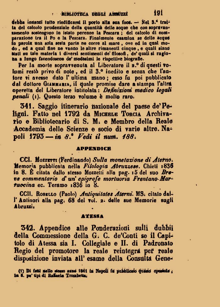 341. Saggio itinerario nazionale del paese de' Pe-ligtìi. Fatto nel 1792 da Michele Torcia Archiva-rio e Bibliotecario di S. Mi e Membro della Reale Accademia delle Scienze e socio di varie altre. Napoli 1793 — in 8.9 Fedi il num. 188.