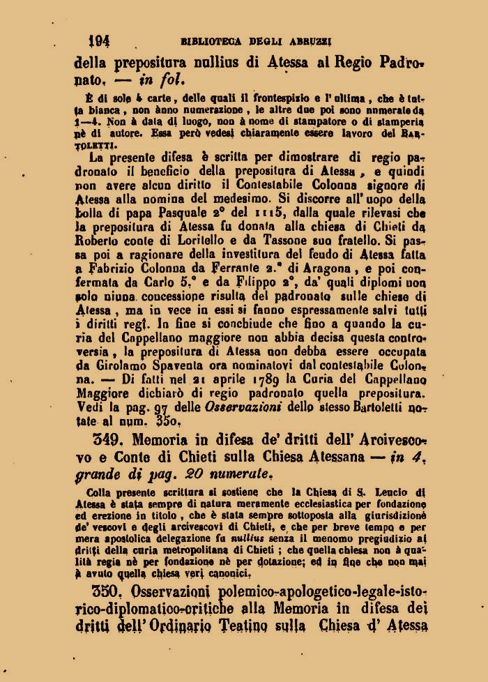 La presente difesa & scritta per dimostrare di regio pa-? dronato il beneficio della prepositura di Atessa , e quindi non avere alcun diritto il Contestabile CoIoana signore dj Atessa alla nomina del medesimo. Si discorre all'uopo della bolla di papa Pasquale 2° del in5, dalla quale rilevasi che la prepositura di Atessa fu donala alla chiesa di Chieti da Roberto conte di Loritello e da Tassone suo fratello. Si passa poi a ragionare della investitura del feudo di Alessa fatta a Fabrizio Colonna da Ferrante 2.' di Aragona , e poi confermata da Carlo 5.Q e da Filippo 2°, da' quali diplomi uoq polo niuna coucessiope risulta del padronato sulle chiese di Atessa , ma in vece in essi si fanno espressamente salvi tulli i diritti reg?. In fine si concbiude che fino a quando la curia del Cappellano maggiore non abbia decisa questa contro* versia, la preposilura di Atessa non debba essere occupata da Girolamo Spaventa ora nominatovi dal contestarle Colonna. — Di fatti nel 2i aprile 1789 la Curia del Cappellano Maggiore dichiarò di regio padronato quella preposilura. Vedi la pag. 97 delle Osservazioni dello stesso Bartoletti no? tate al nqm. odo,