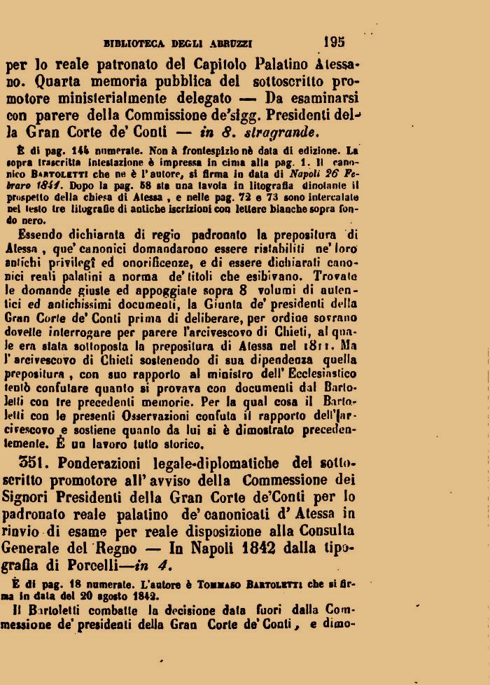 551. Ponderazioni legale-diplomaticbe del sottoscritto promotore all'avviso della Commessione dei Signori Presidenti della Gran Corte de'Conli per lo padronato reale palatino de'canonicati d* Atessa in rinvio di esame per reale disposizione alla Consulta Generale del Regno — In Napoli 1842 dalla tipografìa di Porcelli—in 4.