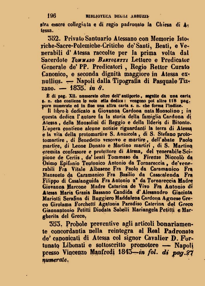 11 libro è dedicalo a Giovanna Cardona nata Monsolino ; in questa dedica l'autore (a la storia della famiglia Cardona dj Alessa, delia Monsolini di Reggio e della Ilderis di Bilonlo. L'opera contiene alcune notizie riguardanti la terra di Alessq e la vita della protomartire S. Anuicola , di S. Stefano proto-tomartire , di Benedetto vescovo e martire, dell'abate Paolo martire, di Leone Donalo e Martino martiri , di S. Martinq eremita confessore e protettore di Atessa, del yenerabile Scipione de Ceriis , de* beali Tommaso da Firenze Niccolò da Osimp Epifanio Teutonico Antonio da Tornareccia, degeneragli Fra Vitale Albasene Fra Paolo da Caramaoico Fra Mansueto da Caramanico Fra Basilio da Casacaleoda Fra Filippo di Casalanguida Fra Antonio 2° da Tornareccia Madre èiovaona Marcone Madre Catarina de Vivo Fra Antonio di Atessa Maria Grazia Bassano Candida d* Alessandro Giacinta Mariolti Serafina di Ruggiero Maddalena Cardona Agnese Greco Girolama Forchetti Agqtonia Paradiso Caterina del Greco Giannaptonio Petitti Diodala Sa bel li Mariangela Peli Iti e Margherita del Greco.