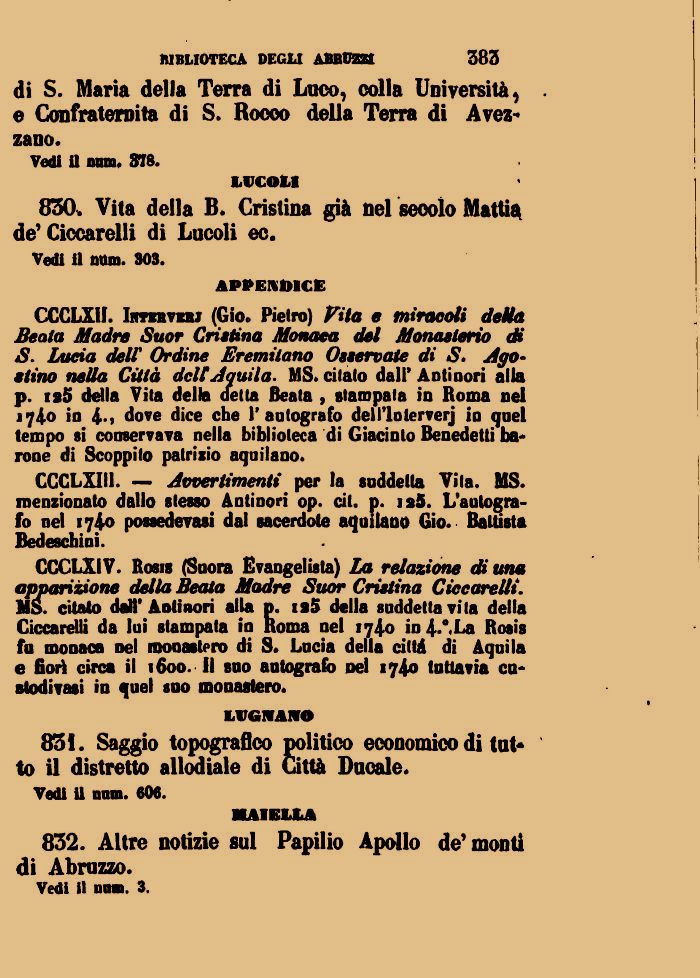 CCCLXII1. — Avvertimenti per la suddetta Vita. MS. menzionato dallo stesso Antinori op. cil. p. is5. L'autografo nel 17^0 possedevasi dal sacerdote aquilano Gio. Battista Bedescbini.