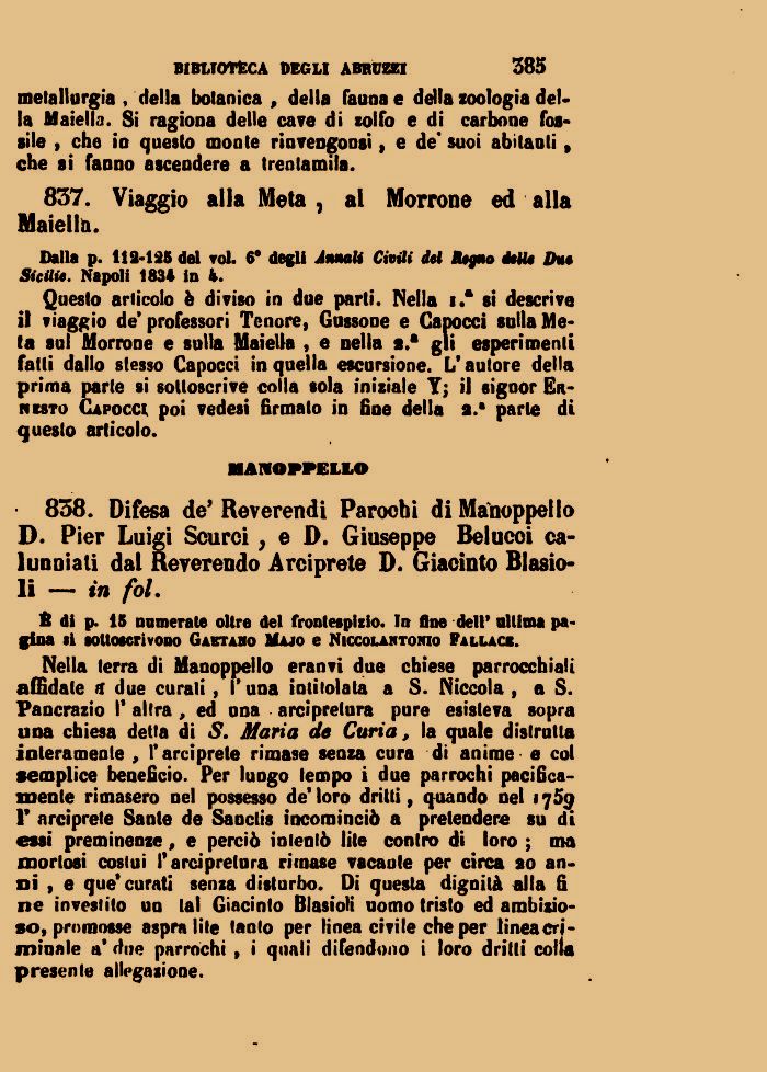838. Difesa de* Reverendi Paroehi di Manoppello D. Pier Luigi Scurci , e D. Giuseppe Belucoi calunniati dal Reverendo Arciprete D. Giacinto Biasio-li — in fol.