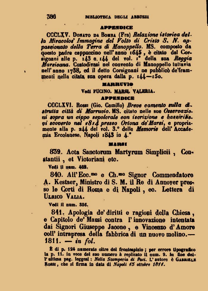 CCCLXV1. Rossi (Gio. Camillo) Breve eamento sulla di<. etrutta città di Marnivi0. MS. citato nelle sue OsserDazioni eopra un cippo sepolcrale eon iscrizione e bassiriiie-pi scoverto nel 1814 presso Ortona de Mar si, e propriamente alla p. 244 dei voJ. 3.° delle Memorie dell' Accademia Ercolauese. Napoli <843 io 4-°