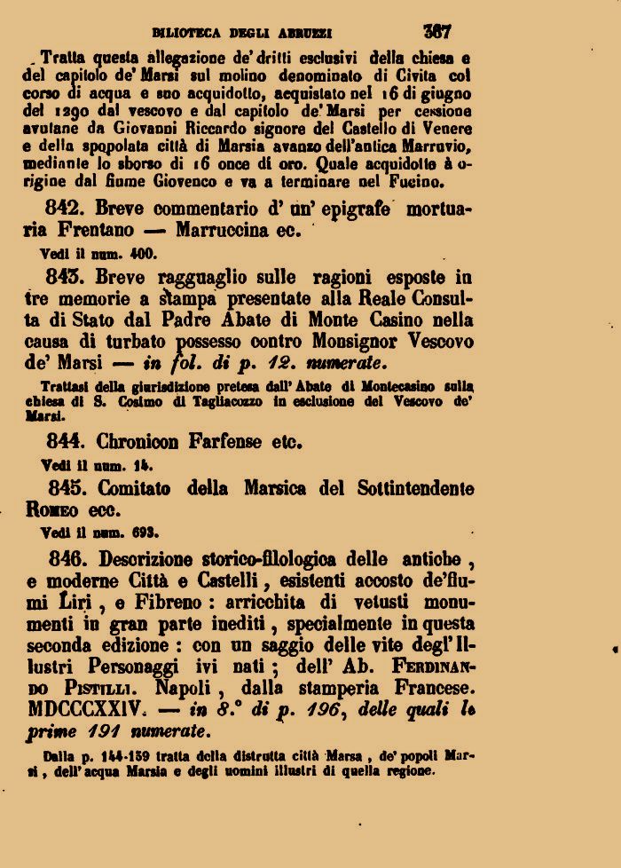 846. Descrizione storico-filologioa delle antiche , e moderne Città e Castelli, esistenti accosto desumi tiri, e Fibreno : arricchita di vetusti monumenti in gran parte inediti, specialmente in questa seconda edizione : con un saggio delle vite degl' Illustri Personaggi ivi nati ; dell' Ab. Ferdinando Pistilli. Napoli , dalla stamperia Francese. MDCCCXXIV, — in di p. 196, delle quali h prime 191 numerate.