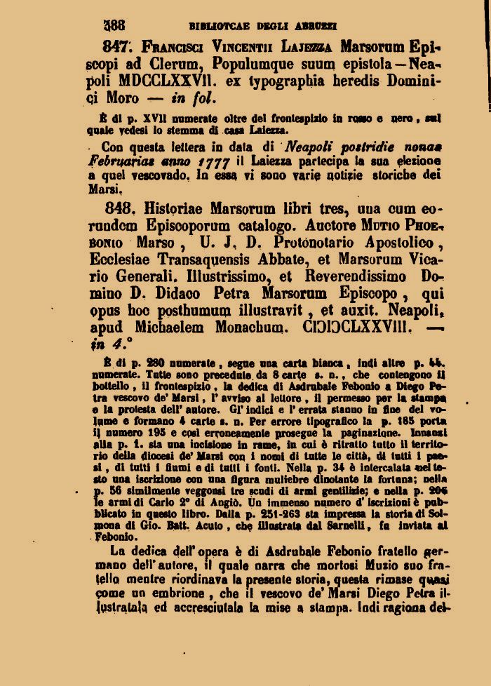 848, Historiae Marsorum libri tres, uua cuoi eo-ruudcm Episcoporum catalogo. Àuctore Mutio Phoe-t domo Marso , U. J, D, Protònotario Apostolico, Ecclesiae Transaqqensis Abbate, et Marsorum Vicario Generali. Illustrissimo, et Reverendissimo Do^ mino D. Didaco Petra Marsorum Episcopo , qui opus hoc posthumum illustravi , et auxit. Neapoli»