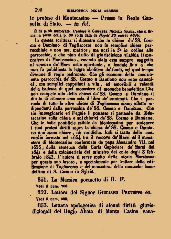 In questa scrittura si dimostra che la chiesa de'SS. Cosimo e Damiano di Tagliacozzo non fu semplice chiesa parrocchiale e non mai matrice, ma anzi la £>• in ordioe alle parrocchie, e che niun dritto di giurisdizione vi abbia il monastero di Monteeasino, essendo stata essa sempre soggetta al vescovo de' Marsi nello spirituale , e fendale fino a che non fu pubblicata la legge aboliliva de' fendi, nel qual tempo divenne di regio padronato. Che gli economi della menzionala parrocchia de' SS. Cosmo e Damiano non sono canonici, ma semplici cappellani a vita, ed amovibili a volontà della badessa di quel monastero di monache benedetline.Che non compete alla della chiesa de'SS. Cosmo e Damiano il diritto di ritenere essa sola il libro de' cresimati. Cbe i par-rochi di latte le altre chiese dì Tagliacozzo siano affatto indipendenti dalla parrocchia de'SS. Cosmo e Damiano. Che sia immaginario ed illegale il possesso si pretende da RWh-tecasioo sulla chiesa e sui chierici de'SS. Cosmo e Damiano. Che le bolle pontificie esibite da Monteeasino per sostenere i suoi pretesi diritti sopra la chiesa de'SS. Cosmo e Damiano non siano chiare, nè veridiche. Indi si traila «Jella concordia formala oel i654 tra il vescovo de'Marsi ed il monastero di Monteeasino confermata da papa Alessandro VII. oel i65$ ; della sentenza della Curia Capitolare de' Marsi del i84i e della ministeriale del ministro del culto degli 8 febbraio i843. L'autore si serve molto della storia Marsicana per questo suo lavoro , e specialmente per trattare della edificazione di Tagliacozzo e del monastero delle monache benedettine di S. Cosmo io Sjlvis.