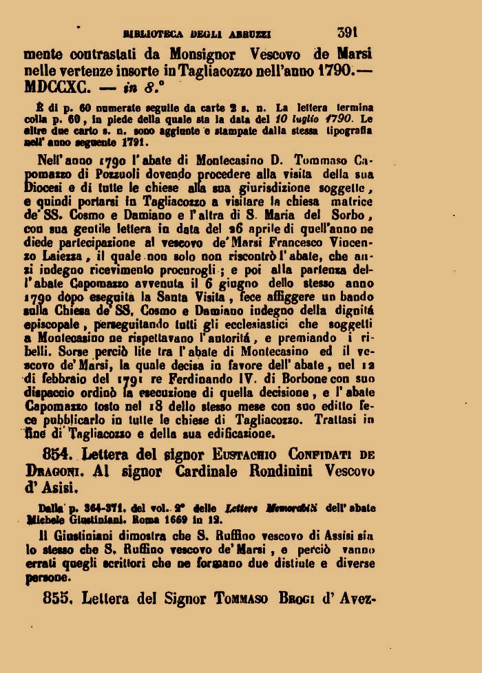 Nell'anno 1790 l'abate di Montecasino D. Tommaso Capomazzo di Pozzuoli dovendo procedere alla visita della sua Diocesi e di tntte le chiese alla soa giurisdizione soggette, e quindi portarsi in Tagliacozzo a visitare la chiesa matrice de' SS* Cosmo e Damiaoo e l'altra di S. Maria del Sorbo, con sua gentile lettera in data del 96 aprile di quell'anno ne diede partecipazione al vescovo de'Marsi Francesco Vincenzo Laiezza, il quale non solo non riscontrò 1* abate, che anzi indegno ricevimento procuragli ; e poi alla partenza dell'abate Capomazzo avvenuta il 6 giugno dello stesso anno 1700 dòpo eseguita la Santa Visita, fece affiggere un bando soli la Chiesa de SS, Cosmo e Damiano indegno della dignità episcopale , perseguitando lotti gli ecclesiastici che soggetti a Monteoasino oe rispettavano l'autorità, e premiando i ribelli. Sorse perciò lite tra l'abate di Montecasino ed il vescovo de'Marsi, la quale decisa in favore dell'abate, nel ia di febbraio del 1^91 re Ferdinando IV. di Borbone con suo dispaccio ordinò la esecuzione di quella decisione, e l'abate Capomazzo tosto nel 18 dello stesso mese con suo editto fece pubblicarlo in tutte le chiese di Tagliacozzo. Trattasi in Bue di Tagliacozzo e della sua edificazione.