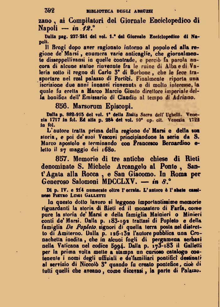 lo questo dotto lavoro si leggono importantissime memorie riguardanti la storia di Rieti ed il monastero di Farfa, come pure la storia de' Marsi e della famiglia Mainieri o Minieri conti de'Marsi. Dalla p. 183-192 trattasi di Popleto e detta famiglia De Popleto. signori di quella terra posta nel distretto di Amiterno. Dalla p. ia6*i3a l'autore pubblica una Cro-nachetla inedita, che in alcuni fogli di pergamena serbasi nella Vaticana nel codice 5994. Dalla p. 173-183 il Galletti per la prima volta mette a stampa nn curioso catalogo contenente i nomi degli ufficiali e de familiari pontifici destinati al servizio di Niccolò 3° quando fu creato pontefice, cioè di tutti quelli che aveaao, come dicevasi, la parte di Palauo.