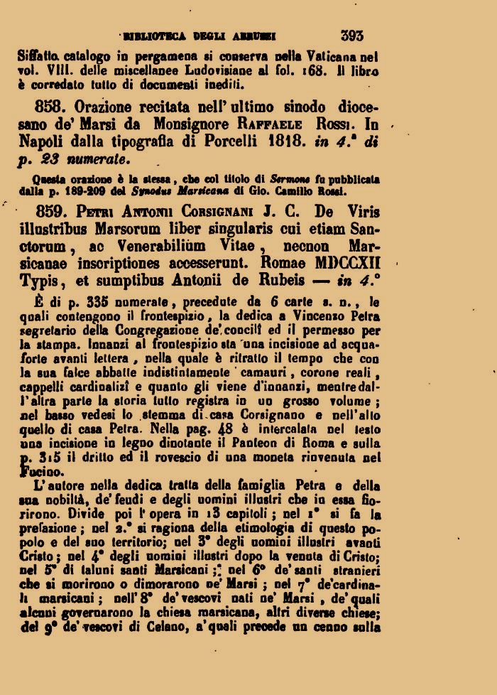 859. Petri Antonii Corsignam J. G. De Viris illustribus Marsorum liber singularis cui etiam San-ctorum, ac Venerabilium Vitae, necnon Mar-sicanae inscriptiones accesserunt. Romae MDGCXII Typis, et sumptibus Antonii de Rubeis — in 4.°