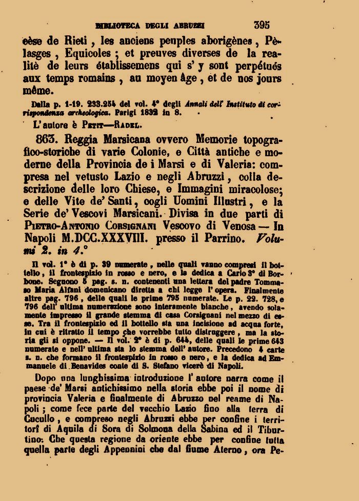 863. Reggia Marsicaoa ovvero Memorie topogra-fioo-storicbe di varie Colonie, e Città antiche e moderne della Provincia de i Marsi e di Valeria: compresa nel vetusto Lazio e negli Abruzzi, colla descrizione delle loro Chiese, e Immagini miracolose; e delle Vite de' Santi, cogli Uomini Illustri, e la Serie de'Vescovi Marsicani. Divisa in due parti di Pietro-Antonio Corsignani Vescovo di Venosa — In