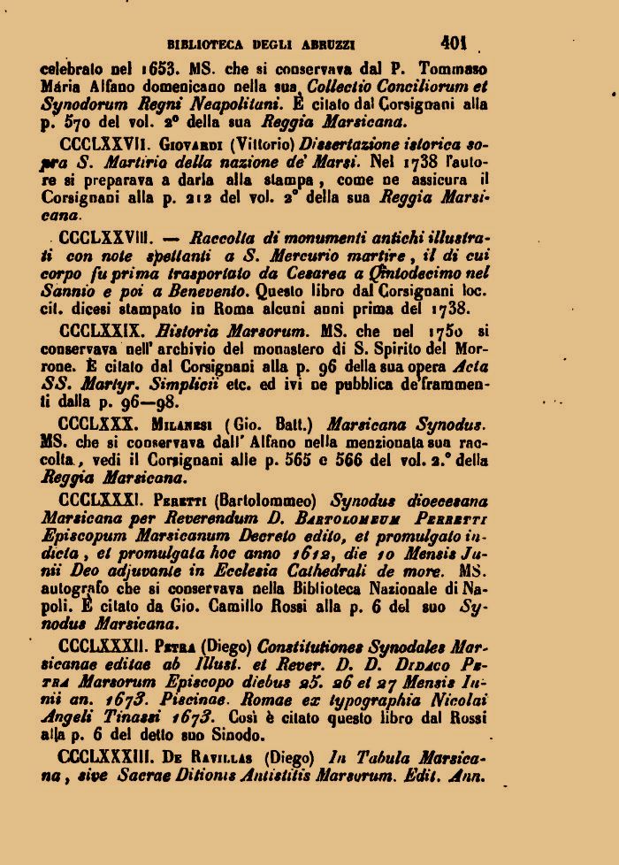CCCLXXX. Milanesi (Gio. Balt.) Marsicana Synodus. MS. che si conservava dall'Alfano nella menzionata sua raccolta., vedi il Corsignani alle p. 565 e 566 del voi. 2.0 della Reggia Marsicana.