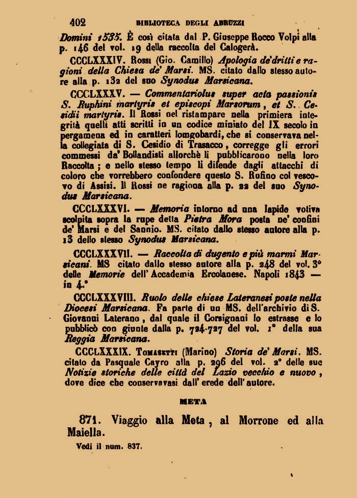 CCCLXXXIX. Tomasetti (Marino) Storia dé Marsi. MS. citato da Pasquale Cayro alla p. 296 del voi. a° delle sue Notizie storiche delle città del Lazio vecchio e nuovo , dove dice che cooservavasi dall'erede dell'autore.
