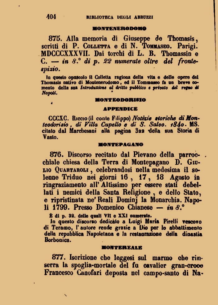 876. Discorso recitato dal Pievano della parroc- . chi al e chiesa della Terra di Montepagano D. Giulio Quartaroli , celebrandosi nella medesima il solenne Triduo nei giorni 16 , 17, 18 Agosto in ringraziamento air Altissimo per essere stati debellati i nemici della Santa Religione , e dello Stato, e ripristinata ne' Reali Dominj la Monarchia. Napoli 1799. Presso Domenico Chianese — in 8.°
