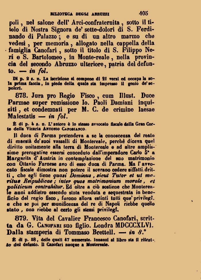 879. Vita del Cavalier Francesco Canofari, scritta da G. Canofari suo figlio. Londra MDCCCXLV1. Dalla stamperia di Tommaso Brettell. — in .°