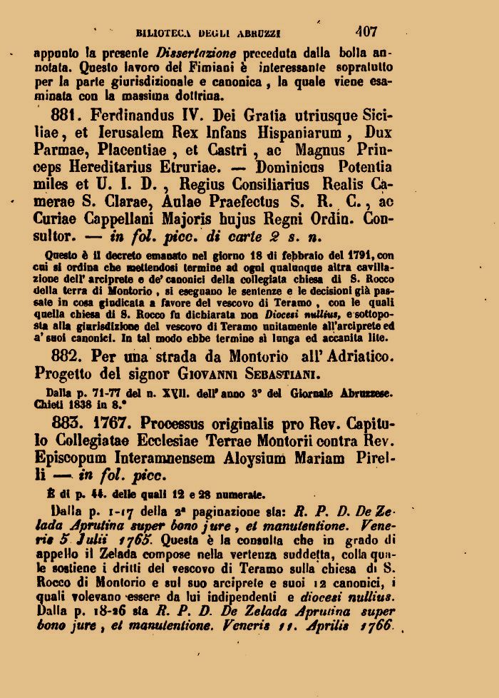 Questo è il decreto emanato nel giorno 18 di febbraio del 1791, con cni si ordina che mettendosi termine ad ogni qualunque altra cavitazione dell' arciprete e de' canonici della collegiata chiesa di s. Rocco della terra di Montorio , si eseguano le sentenze e le decisioni già passate in cosa giudicala a favore del vescovo di Teramo , con le quali quella chiesa di s. Rocco fu dichiarata non Diocesi nullius, e sottoposta alla giarisdizione del vescovo di Teramo unitamente all'arciprete ed a* suoi canonici. In tal modo ebbe termine sì lunga ed accanita lite.