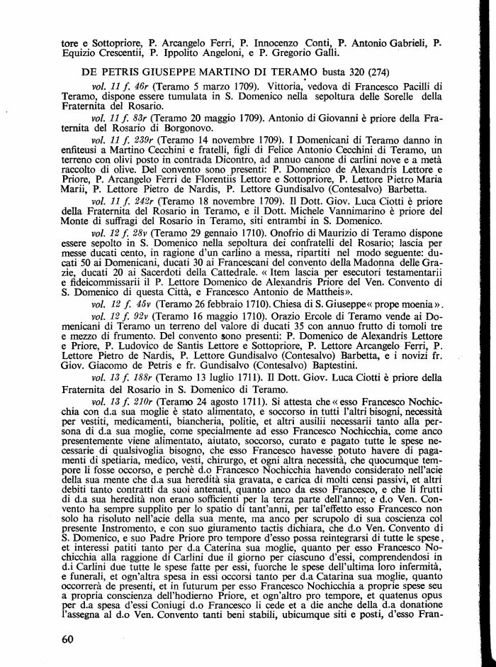 voi. 11 f. 239r (Teramo 14 novembre 1709). I Domenicani di Teramo danno in enfiteusi a Martino Cecchini e fratelli, figli di Felice Antonio Cecchini di Teramo, un terreno con olivi posto in contrada Dicontro, ad annuo canone di carlini nove e a metà raccolto di olive. Del convento sono presenti: P. Domenico de Alexandris Lettore e Priore, P. Arcangelo Ferri de Florentiis Lettore e Sottppriore, P. Lettore Pietro Maria Marii, P. Lettore Pietro de Nardis, P. Lettore Gundisalvo (Contesalvo) Barbetta.