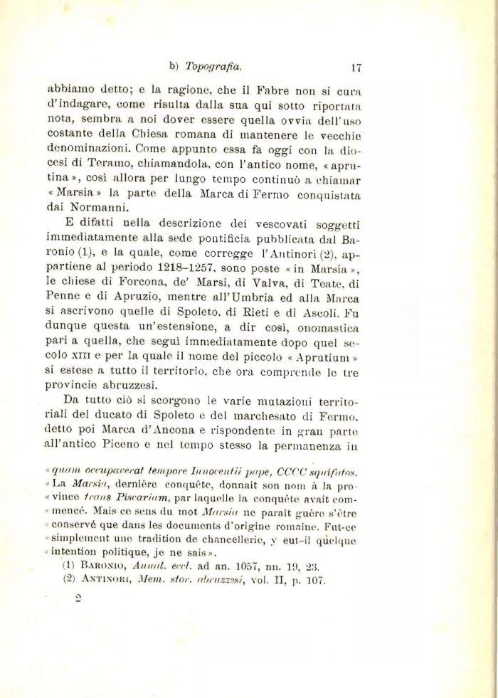 E difatti nella descrizione dei vescovati soggetti immediatamente alla sede pontificia pubblicata dal Ba-ronio (1), e la quale, come corregge l'Antinori (2). appartiene al periodo 1218-1257. sono poste « in Marsia », le chiese di Forcona, de' Marsi, di Valva, di Teate, di Penne e di Apruzio, mentre all'Umbria ed alla Marca si ascrivono quelle di Spoleto, di Rieti e di Ascoli. Fu dunque questa un'estensione, a dir cosi, onomastica pari a quella, che seguì immediatamente dopo quel secolo xm e per la quale il nome del piccolo « Aprutium » si estese a tutto il territorio, che ora comprende le tre Provincie abruzzesi.