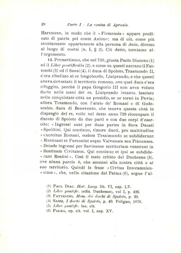 14. Premettiamo, che nel 739, giusta Paolo Diacono (1) ed il Liber pontificalis (2). e come su questi narrano il Fatteschi (3) ed il Sansi (4). il duca di Spoleto,Trasmondo II, s'era ribellato al re longobardo. Liutprando, e che questi aveva devastato il territorio romano, ove quel duca s'era rifuggito, perchè il papa Gregorio III non avea voluto darlo nelle mani del re. Liutprando intanto, lasciato nelle conquistate città un presidio, se ne tornò in Pavia; allora Trasmondo, con l'aiutu de' Romani c di Gode-scalco. duca di Benevento, che teneva questa città in dispregio del re, voile nel detto anno 739 rioccupare il ducato di Spoleto da due parti e con due corpi d'esercito: « Ingressi sunt per duas partes in fines Ducati « Spolitini. Qui continuo, timore ducti, prò multitudine « cxcrcitus Romani, eodem Trasimundo se subdiderunt Marsicani et Furconini atque Valvenses seu Pinncnses. « Deinde ingressi per Savinense territorium venerunt in « Keatinam Civitatem. Qui continuo et ipsi se subdide-« runt Reatini ». (.osi il testo critico de! Duchesne (5), ove niuna parola è, che accenni alla nostra città o al suo territorio. Quindi la frase « Civitas Interamnien-«sium», che, nella citazione del Palma (6), segue l'ulti) Paul Diac. Hist. Long. lib. VI, cap. LV.
